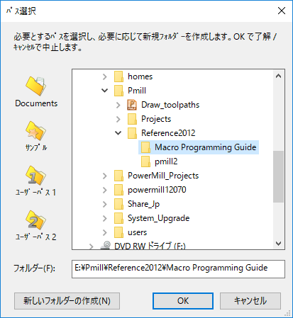 適切なディレクトリに移動します。必要に応じて、新しいフォルダーの作成 ボタンを使用します。ダイアログ下部にパス名が表示されます。この場合、E:\Pmill\Reference2012\Macro Programming Guide です。[OK]をクリックします。