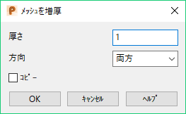 - [メッシュツール]タブ > [トライアングルメッシュ]パネル > [増厚]をクリックして、[メッシュを増厚]ダイアログを表示します。