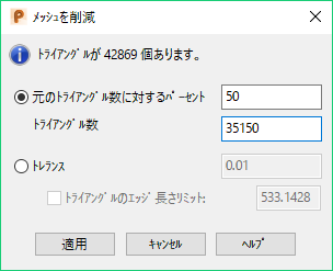 - 適用 をクリックして、メッシュ内のトライアングル数を削減します。 ダイアログは開いたままであるため、ダイアログ内の値を変更して、トライアングルメッシュの数を再び削減することができます。