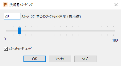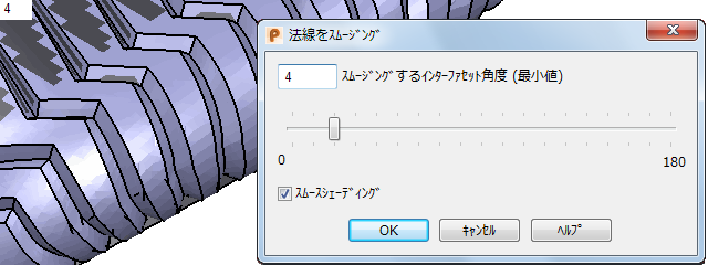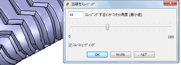 法線をスムージング ダイアログを使用してスムージングの角度を指定し、インポートしたトライアングルファイルのトライアングルメッシュの外観を改善することができます。