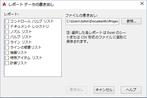 [書き出し]ボタンは、1 つまたは複数のレポートの種類を選択し、書き出しファイルを指定した場合にのみアクティブになります。