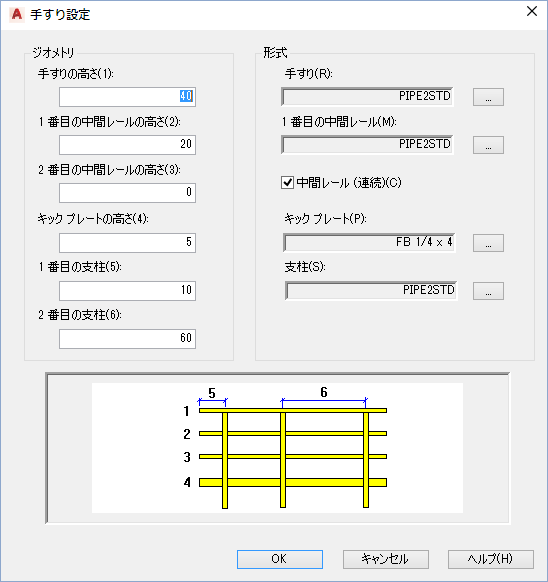 手すりのジオメトリ設定を設定します。括弧内に示されている数値は、プレビュー イメージ内に表示されているジオメトリに対応しています。