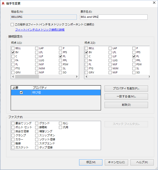 注: 新しい終端タイプを作成することができます。詳細は、「接続」を参照してください。ファスナを指定する場合、それらが配管スペック内に存在する必要があります。