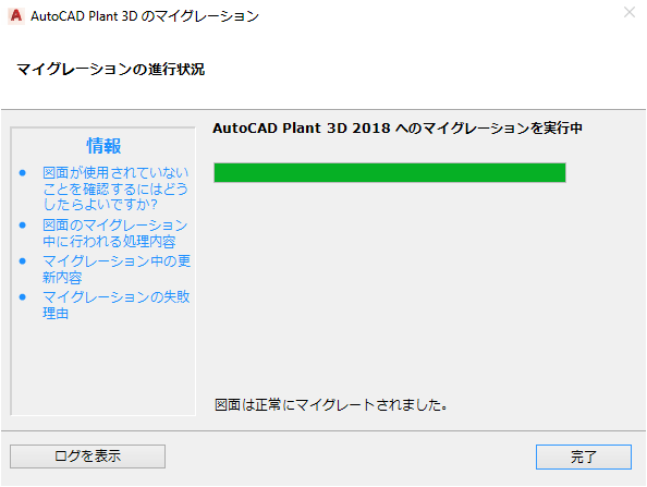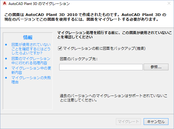 旧バージョンで作成された図面を現在バージョンで作成したプロジェクトに追加しようとすると、図面のマイグレーション ウィザードが起動します。マイグレーションは、プロジェクトに追加しようとしている図面のみをマイグレート処理します。旧バージョンでさらに図面の編集が必要になる場合に備えて、マイグレーション中にバックアップを作成できます。図面のマイグレーション処理をキャンセルすると、図面は元の状態に戻ります。