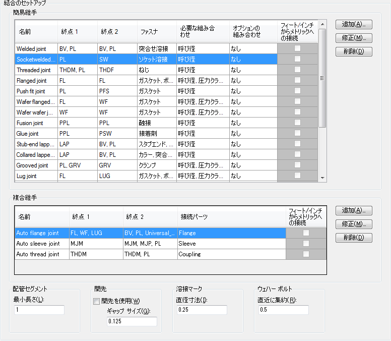 簡易継手および複合継手のタイプをセットアップします。また、配管セグメントの最小長さ、コネクタの表示設定、ボルトの集約係数も設定します。