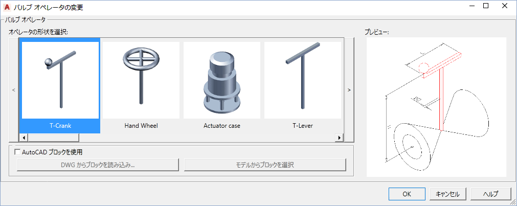 バルブを 3D モデルに配置した後で、別のオペレータを指定することができます。そのオペレータを配管スペックやカタログに追加する必要はありません。