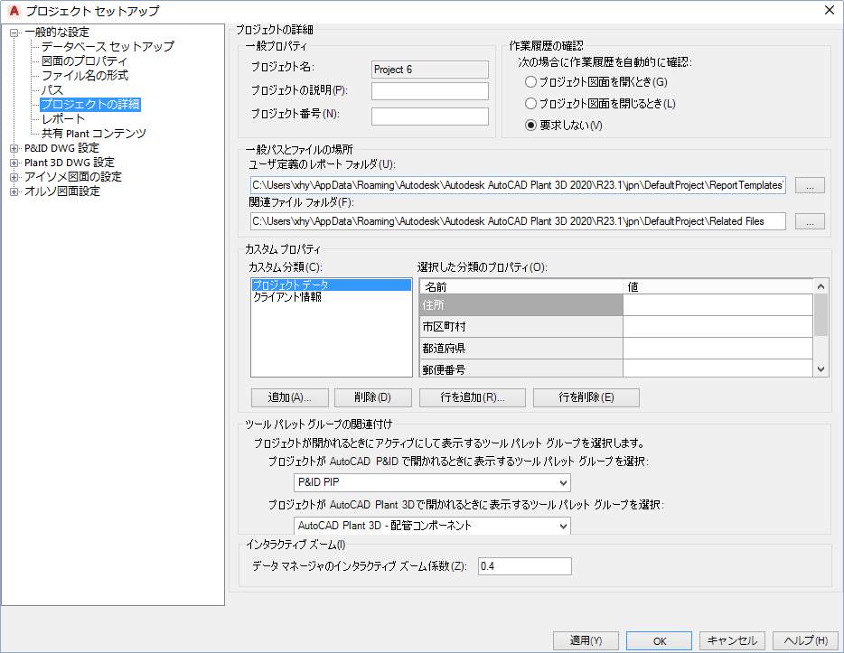 コンポーネントの記号、タグ付けルール、注釈プロパティ、画層、色など、プロジェクトや作図の基本設定を設定します。