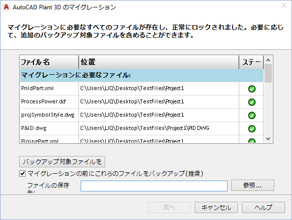 プロジェクトと関連するファイルをバックアップすることを選択できます。必要に応じ、後で、作成元のバージョンの AutoCAD P&ID でプロジェクト ファイルを開いて編集することができるように、ファイルをバックアップすることをお勧めします。