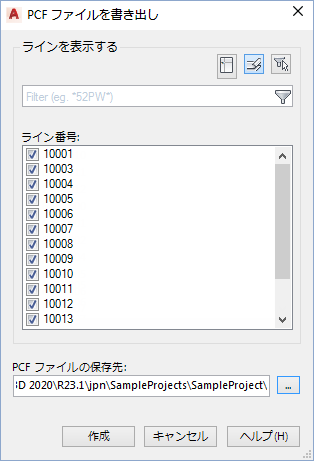 書き出される配管コンポーネント ファイル(PCF)に含めるラインを選択します。