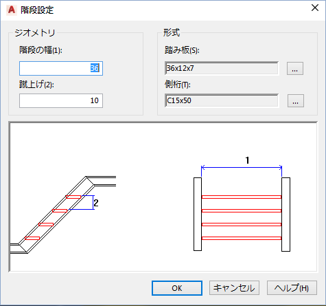 階段のジオメトリ設定を編集します。括弧内に示されている数値は、プレビュー イメージ内に表示されているジオメトリに対応しています。