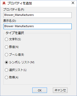 - [プロパティ名]に、シンボル リスト値の基になるコンポーネントまたはラインのプロパティ名を入力します(例: Blower_Manufacturers)。