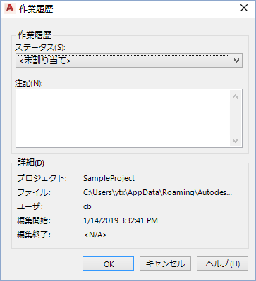 管理者が作業履歴オプションを有効にしている場合、プロジェクト マネージャから図面を開くとき、または図面を閉じるときに、[作業履歴]ダイアログ ボックスが表示されます。