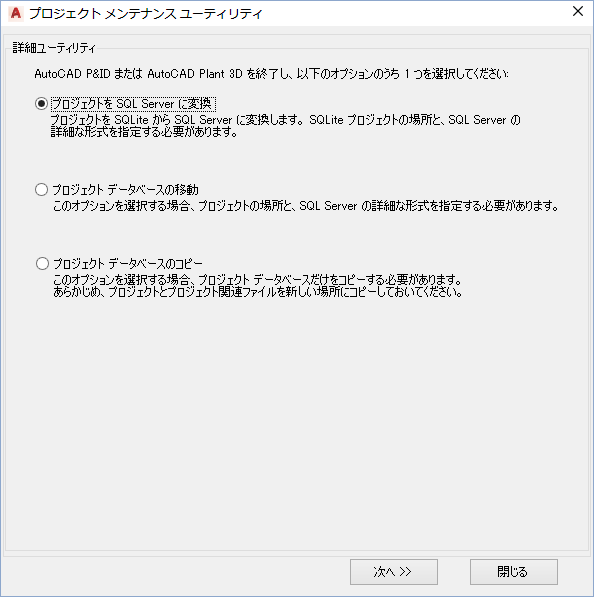 [次へ]をクリックすると、[プロジェクト メンテナンス ユーティリティ - プロジェクトを SQL Express に変換]ダイアログ ボックスが表示されます。