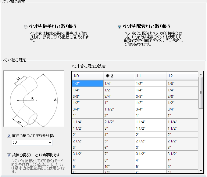 [ベンド管切り替え]をクリックして、ベンド管を有効にします。