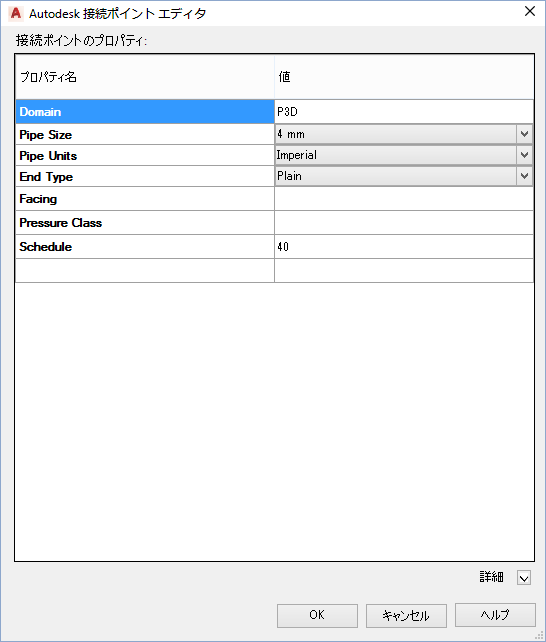 プロパティの値が表示されます。PLANTINSERTAUTODESKCONNECTIONPOINT コマンドで作成された接続ポートは、P3D という[ドメイン]値になります。