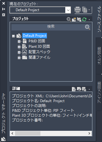 [プロジェクト マネージャ]には、[ソース ファイル]タブ、[オルソ図面]タブ、[アイソメ図面]タブの 3 つのタブがあります。