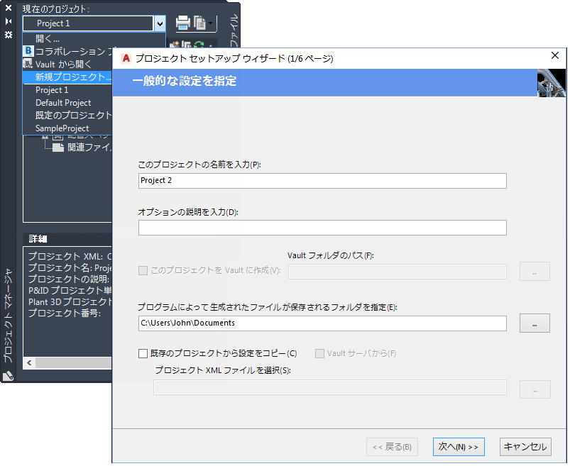 通常、CAD マネージャがプロジェクト テンプレートを設定します。テンプレートとは、会社の標準スペックを満たした構成内容を持つ既成のプロジェクトを指します。CAD マネージャは別のプロジェクトをテンプレートとして指定し、新しいプロジェクトの名前と場所を設定できます。新しいプロジェクトには、テンプレートとして使用されたプロジェクトから設定が継承されますが、この設定は現在の要件を満たすように変更できます。