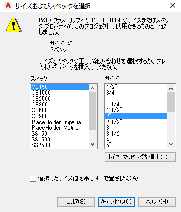 - サイズまたはスペックが一致しない場合は、[サイズおよびスペックを選択]ダイアログ ボックス、次の操作を行います。