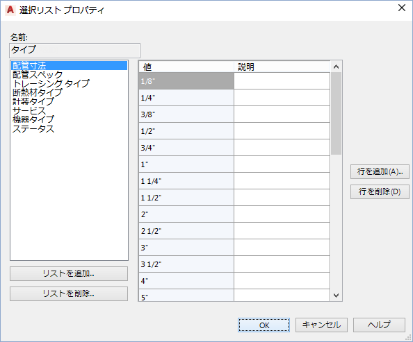 データ フィールドのカテゴリを設定します。既定のカテゴリには、[配管サイズ]、[配管スペック]、[トレーシング タイプ]、[インシュレーション タイプ]、[計装タイプ]、[サービス]、[機器タイプ]があります。カテゴリと値は、使用する工業規格(PIP、ISO、または ISA など)で決定される場合があります。