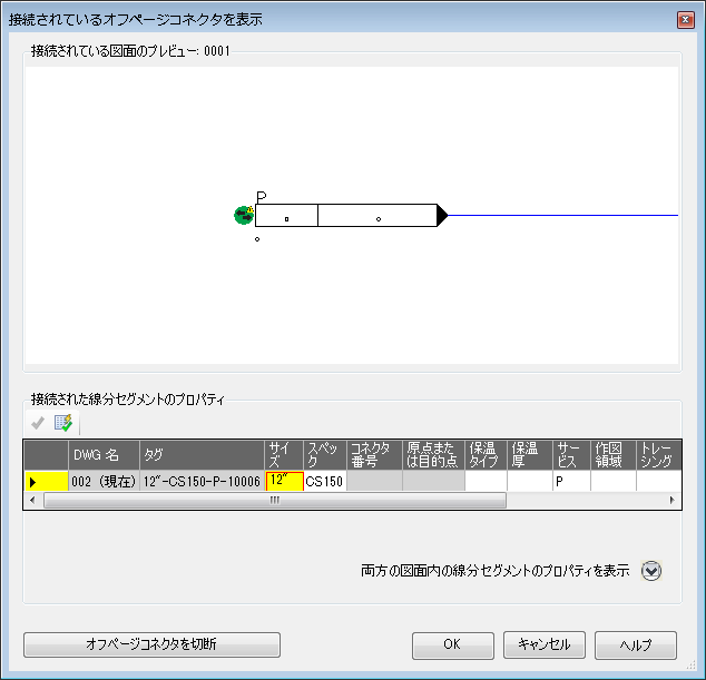 図面内で選択したオフページ コネクタを使用して、接続されている図面のオフページ コネクタを表示し、ハイライト表示されたプロパティの不一致を修正することができます。
