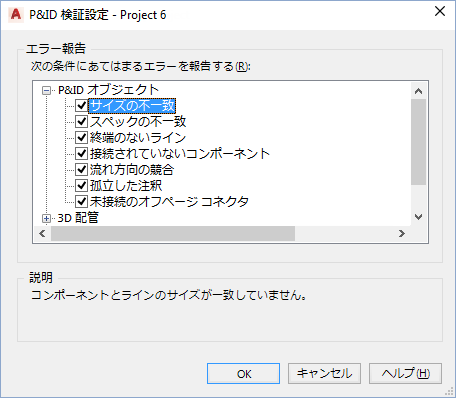 [P&ID 検証設定]ダイアログ ボックスの[エラー報告]ツリーで、P&ID オブジェクトと AutoCAD オブジェクト ノードを展開します。プロジェクト検証でフラグを付けるエラー タイプのチェック ボックスをオンにします。