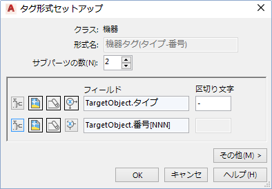 ヒント: 必要な数量のプロパティをサブパーツとして使用することができます。区切り文字は、サブパーツのフィールドに入力しないでください。 区切り文字を[区切り文字]ボックス内に配置すると、区切り文字はタグ内でサブパーツの間に表示されます。たとえば N-N-N のように、同じフィールドにダッシュを入力すると、予期しない結果になる場合があります。