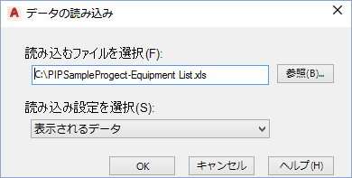 プロジェクトまたは図面データが含まれている、Microsoft® Excel スプレッドシートまたはカンマ区切り値(CSV)ファイルを読み込みます。