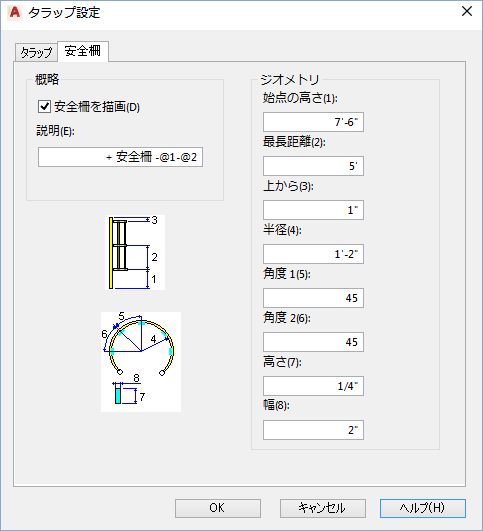 安全柵のジオメトリ設定を編集します。括弧内に示されている数値は、プレビュー イメージ内に表示されているジオメトリに対応しています。