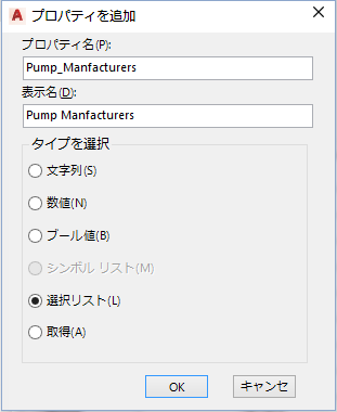 - [プロパティ名]に、新しいプロパティの名前を入力します(例: Pump_Manufacturers)。この名前にスペースを含めることはできません。