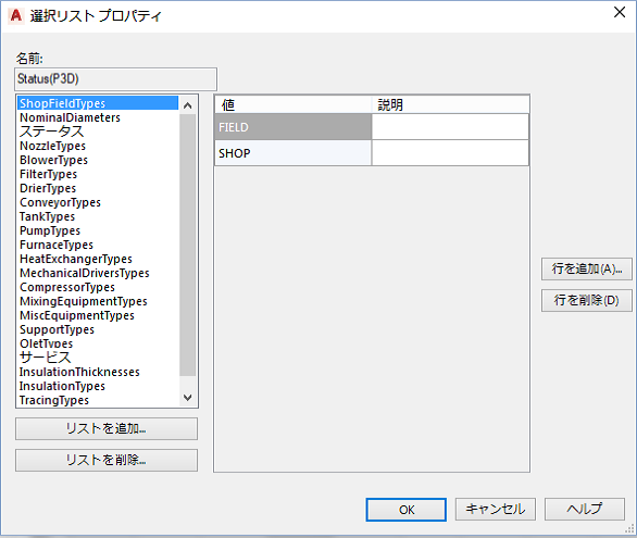 選択リストを使用して、配管スペック、配管サイズ、計装の種類などの項目に標準サイズを適用することができます。また、設計者が事前に定義されたオプションのリストから選択できるようにする場合も、選択リストを使用します。