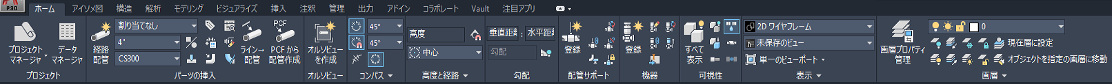 [3D 配管ホーム]タブは 3D 配管ワークスペースの一部です。