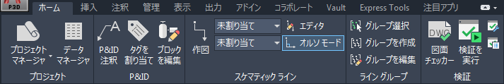 P&ID [ホーム]タブは、P&ID PIP、P&ID ISO、P&ID ISA、P&ID DIN、および P&ID JIS-ISO の各ワークスペースの一部です。