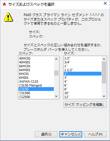 P&ID オブジェクトのサイズ プロパティまたはスペック プロパティは、対応するモデリング オブジェクトのサイズまたはスペックと異なる場合があります。オブジェクトをモデル内に配置する前に、適切なサイズおよびスペックを選択できます。