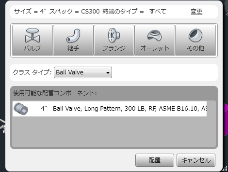 配置するコンポーネントを指定します。現在のスペック、サイズ、終端のタイプ、クラスのタイプと一致する配管コンポーネントのリストを表示します。