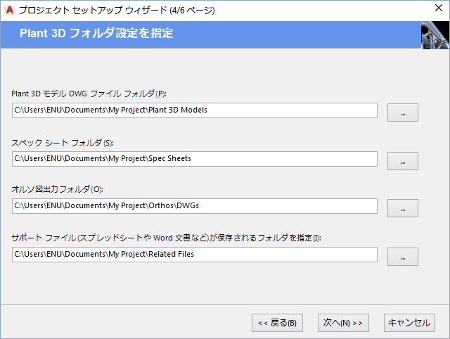 - [プロジェクト セットアップ ウィザード(3/6 ページ)]で、P&ID 図面のパスを入力し、P&ID ツール パレットの内容の規格を選択します。[次へ]をクリックします。