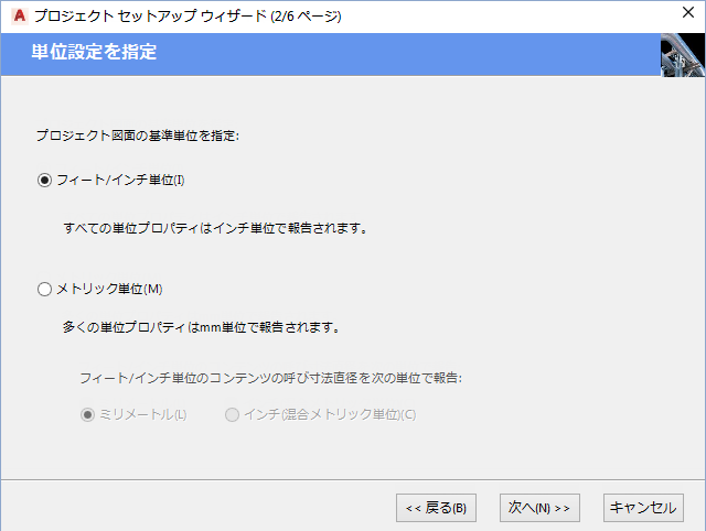 - [プロジェクト セットアップ ウィザード(2/6 ページ)]で、プロジェクトをフィート/インチ単位にするのかメートル単位にするのかを指定します。メートル単位を選択した場合は、コンテンツがフィート/インチ単位である場合の呼び径の単位を指定します。[次へ]をクリックします。