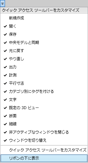 クイック アクセス ツールバーはリボンの上または下に表示することができます。設定を変更するには、クイック アクセス ツールバーで、[クイック アクセス ツールバーをカスタマイズ]ドロップダウン リスト