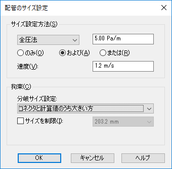 [配管のサイズ設定]ダイアログのオプションは、その方法を単独で選択([のみ]を選択)することも、他の方法と組み合わせて選択([および]または[または]を選択)することもできます。