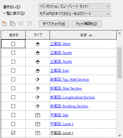モデルをさまざまな形式に書き出す場合は、[書き出し]ダイアログのツールを使用して、含めるビューとシートを選択します。後で再利用するために、選択したセットを保存します。