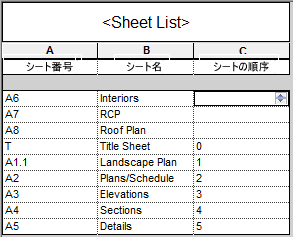 シートのシーケンス番号を入力すると、Revit LT で、リストが再度並べ替えられ、行が順番に配置されます。