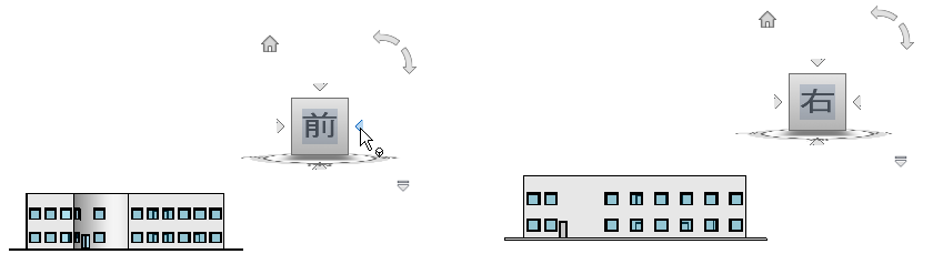 面ビューのいずれかからモデルを表示するときに ViewCube がアクティブの場合は、ViewCube の近くに 4 つの平行投影三角形が表示されます。 これらの三角形の 1 つを使用して、隣の面ビューに切り替えます。