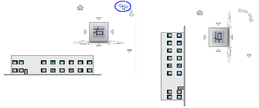面ビューのいずれかからモデルを表示すると、ViewCube の近くに 2 つのロール矢印ボタンが表示されます。ロール矢印を使用して現在のビューをビューの中心を軸として 90 度時計回りまたは反時計回りに回転します。