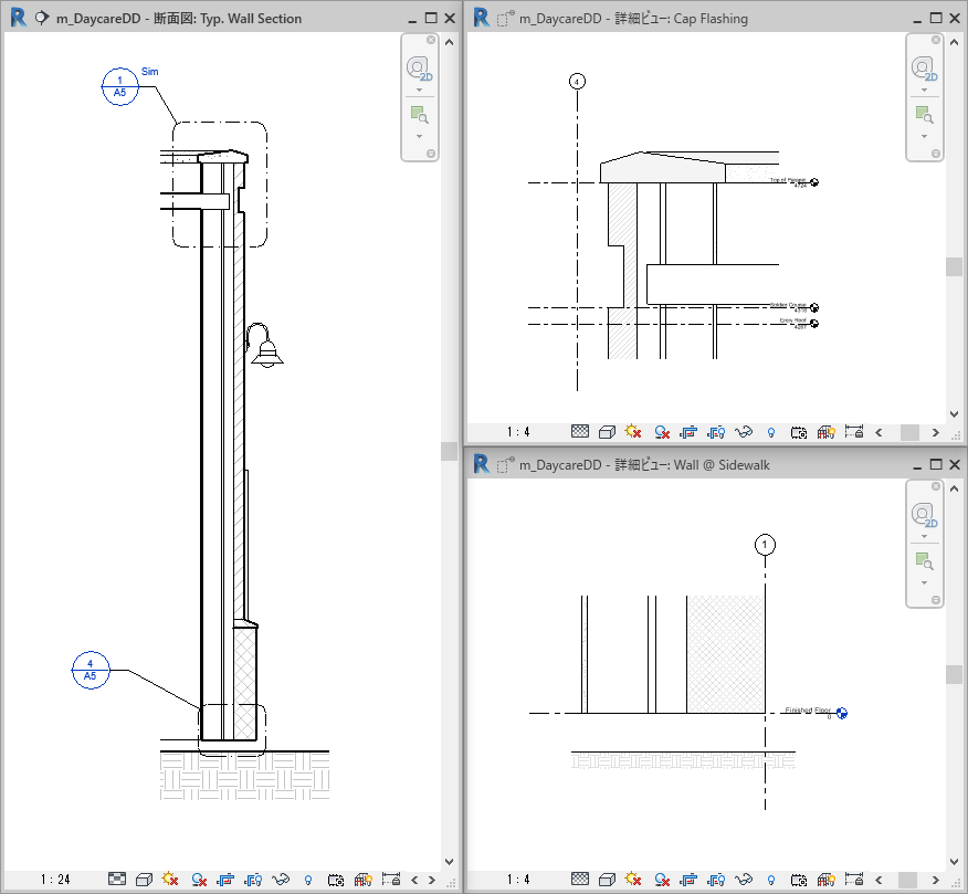平面図ビュー、断面図ビュー、詳細ビュー、立面図ビューに詳細吹き出しまたは吹き出しビューを追加できます。ビューに吹き出し領域線を描画すると、Revit LT は、吹き出しビューを作成します。次に、その吹き出しビューに詳細を追加すると、建物モデルのその部分について詳細な情報を提供できます。