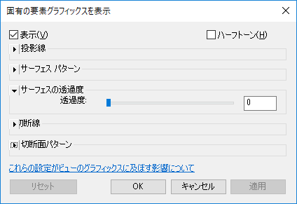 - サーフェスの透過性: 要素の線だけを表示し、サーフェスは表示しません。サーフェスの透過性のパーセンテージを設定するには、[透過性]スライダを使用します。