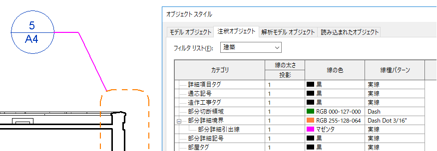 4. 部分詳細引出線、吹き出し引出線、吹き出し記号に目的の設定を指定するには、[線の太さ]、[線の色]、[線種パターン]の各列を使用します。
