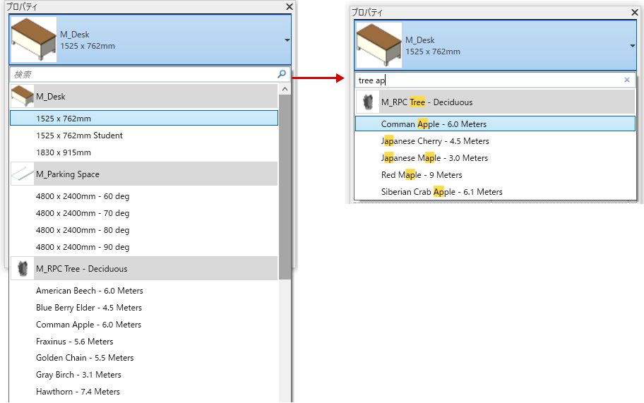 タイプ セレクタで検索機能を使用すると、必要なコンテンツを素早く検索できます。検索機能が利用できる場合、キーワードの入力と検索結果のナビゲートはすべて同じ操作で実行できます。