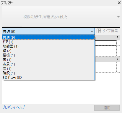 タイプ セレクタのすぐ下にあるのは、ツールにより配置される要素のカテゴリ、または作図領域で選択された要素のカテゴリと数を識別するフィルタです。複数のカテゴリまたはタイプが選択されている場合、すべてに共通のインスタンス プロパティのみパレットに表示されます。複数のカテゴリが選択されている場合、フィルタのドロップダウンを使用して、特定のカテゴリまたはビュー自体のプロパティのみ表示します。特定のカテゴリを選択しても、選択セット全体には影響を与えません。