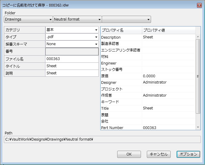 [コピーを名前を付けて保存]機能を使用して、パーツ、アセンブリ、図面、またはプレゼンテーション ファイル(DWG、STP、PDF、DXF など)をコピーします。