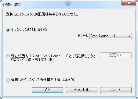 - [外構を選択]ダイアログで、[インスタンスの移動先]ラジオ ボタンをクリックし、リンクが現在存在する位置名(例: Arc House 1-3)を選択します。