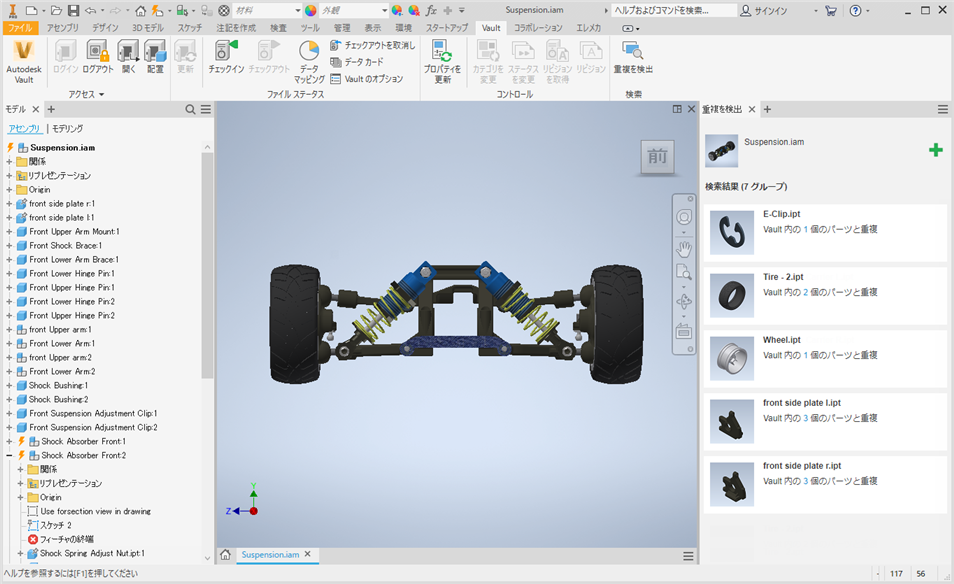 アセンブリ内のパーツ ファイルの重複が[重複を検索]パネルに表示されます。アセンブリ内で検索すると、重複するグループが最初に表示されます。グループをクリックして、Vault から重複パーツ ファイルを確認します。